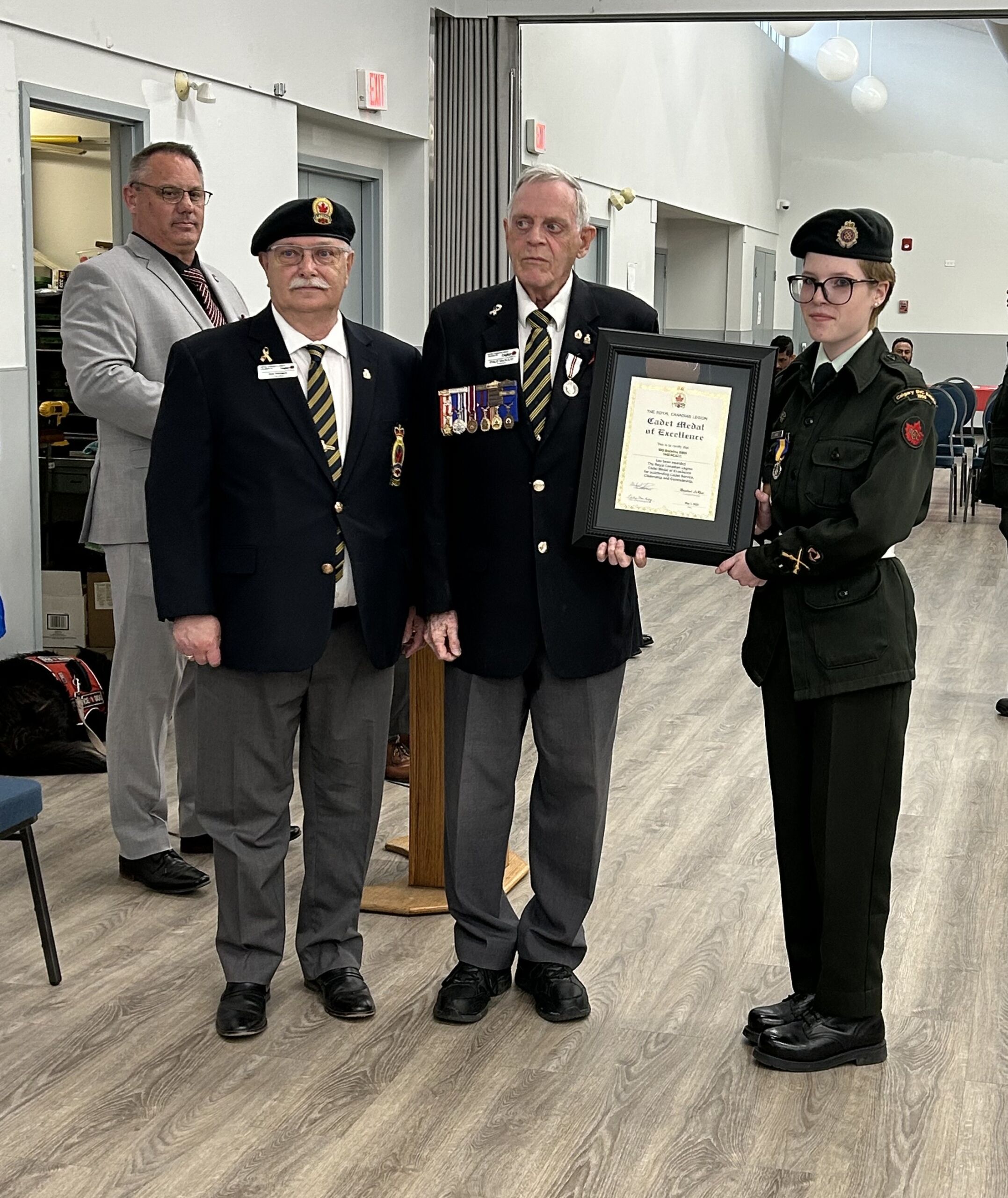 On June 4, 2025 Phil MacAulay, the President of the Royal Canadian Legion No.1 Branch proudly presented the Royal Canadian Legion Cadet Medal of Excellence to Warrant Officer Jean Smid, a Cadet of the Calgary 1955 Royal Canadian Army Cadet Corps.